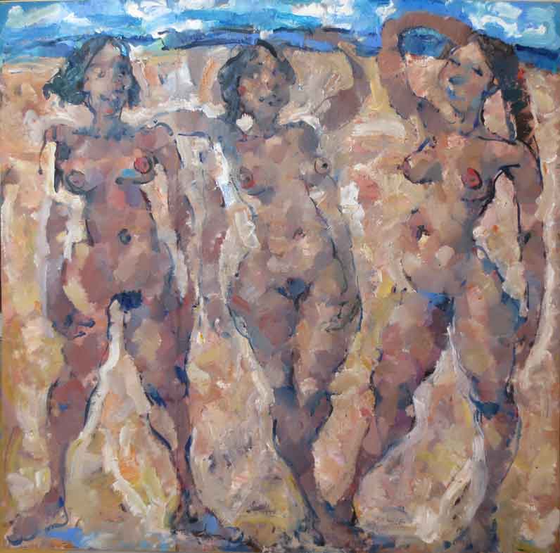 Die drei Grazien auf dem Strand, 2014/10, 145 x 145 cm, Öl auf Karton, 3.500,-€,
